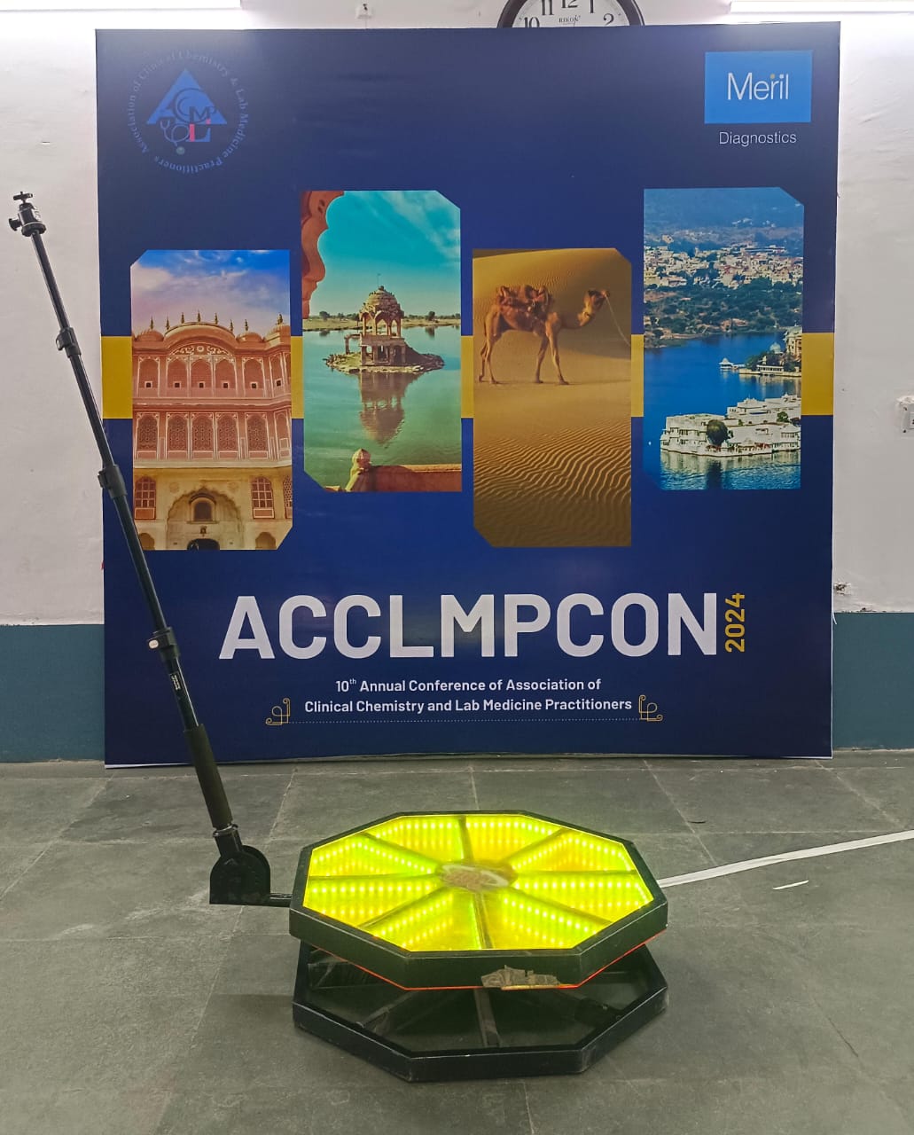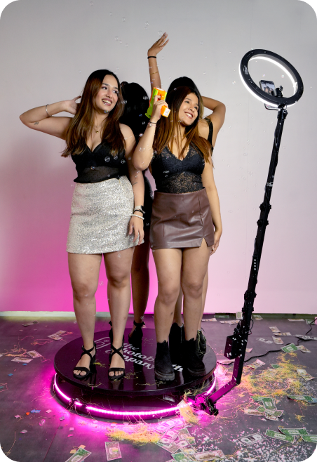 The setup features a platform for guests to stand on, surrounded by a camera affixed to a motorized rotating arm. As the camera orbits, it records brief video clips (typically 5 to 15 seconds) that are then enhanced with slow-motion effects, curated soundtracks, custom overlays or branding, and instant digital sharing options such as text, email, or QR codes.